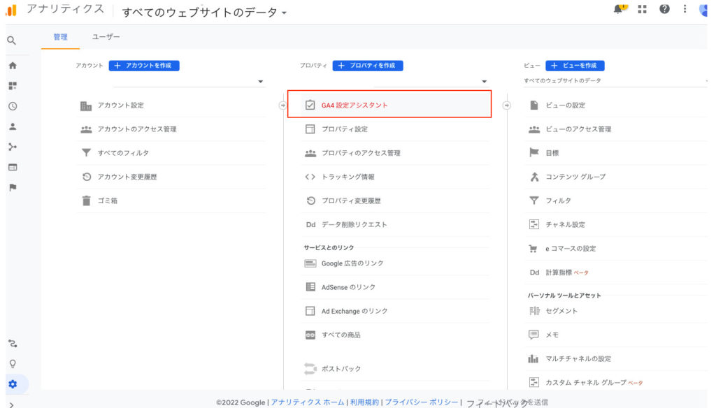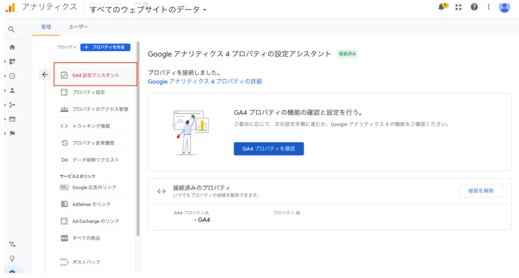 すでにユニバーサルアナリティクスを導入しているサイトであれば、アナリティクスの該当プロパティ管理画面を開いて、「GA4設定アシスタント」というリンクから指示に沿って設定します。