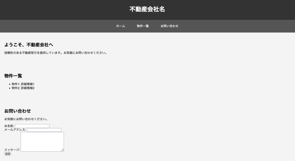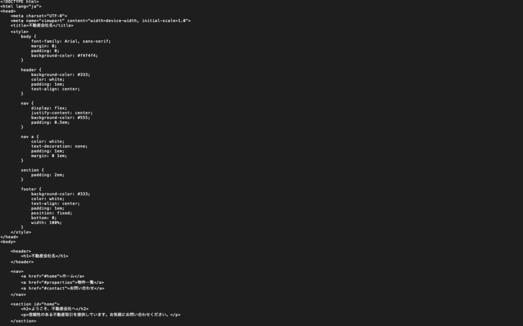 ホームページのコンテンツや構造に関するアイデアを得るためにチャットGPTを利用できます。例えば、「不動産会社向けのホームページを作成してください」とプロンプトを入力すると、チャットGPTはあっという間に以下のようにコードを記述してくれます。