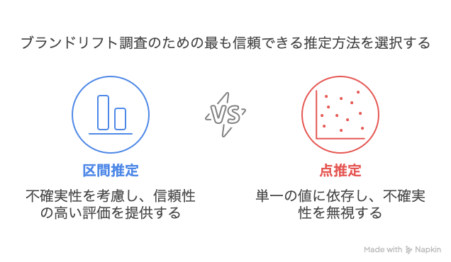 ブランドリフト調査の結果を分析する上で重要な概念の一つが「区間推定」です。区間推定とは、標本から得られた統計量に基づいて、母集団の真の値が含まれる可能性のある範囲を推定する方法です。一方、「点推定」は、標本から得られた一つの値(例えば、平均値)を母集団の真の値として推定する方法です。